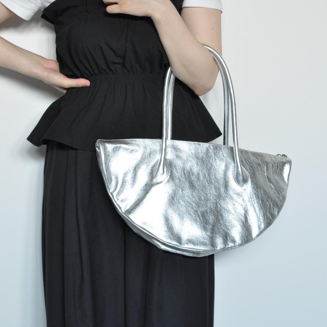 広げると丸いクッションのようなフォルムが印象的なバッグ。